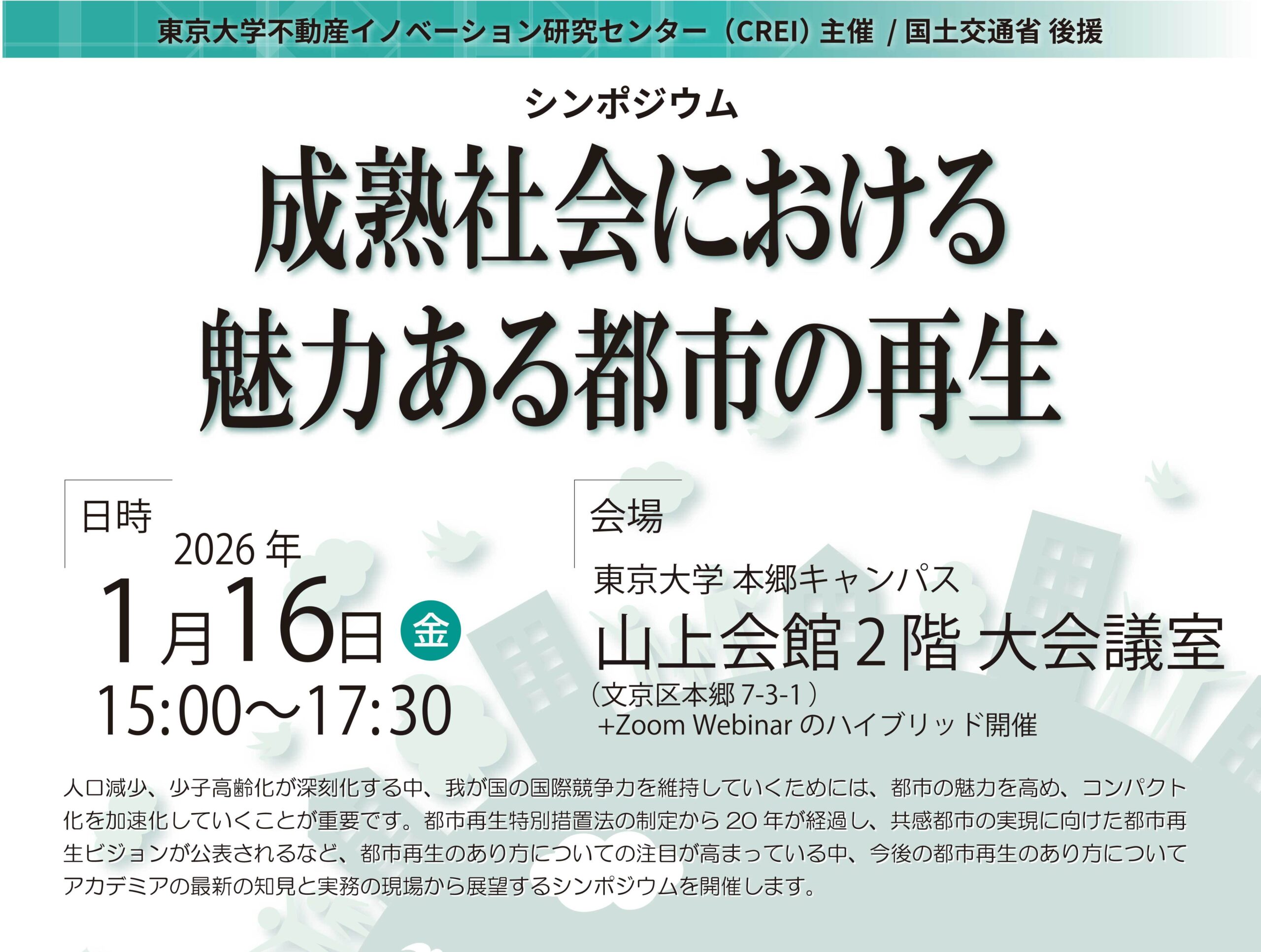 東大CREIシンポジウム『成熟社会における魅力ある都市の再生』(主催:東大CREI / 後援:国土交通省)を2026年 1月16日(金)に開催いたします