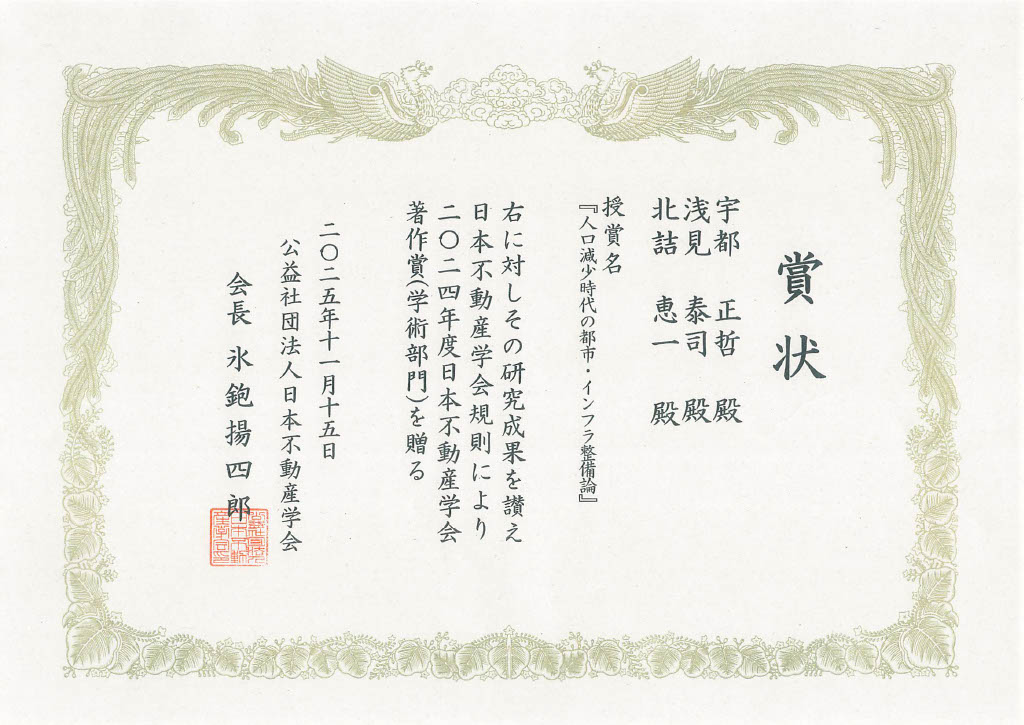 浅見 泰司CREI副機構長らによる著作「人口減少時代の都市・インフラ整備論」が、2024年度日本不動産学会『著作賞(学術部門)』を受賞しました
