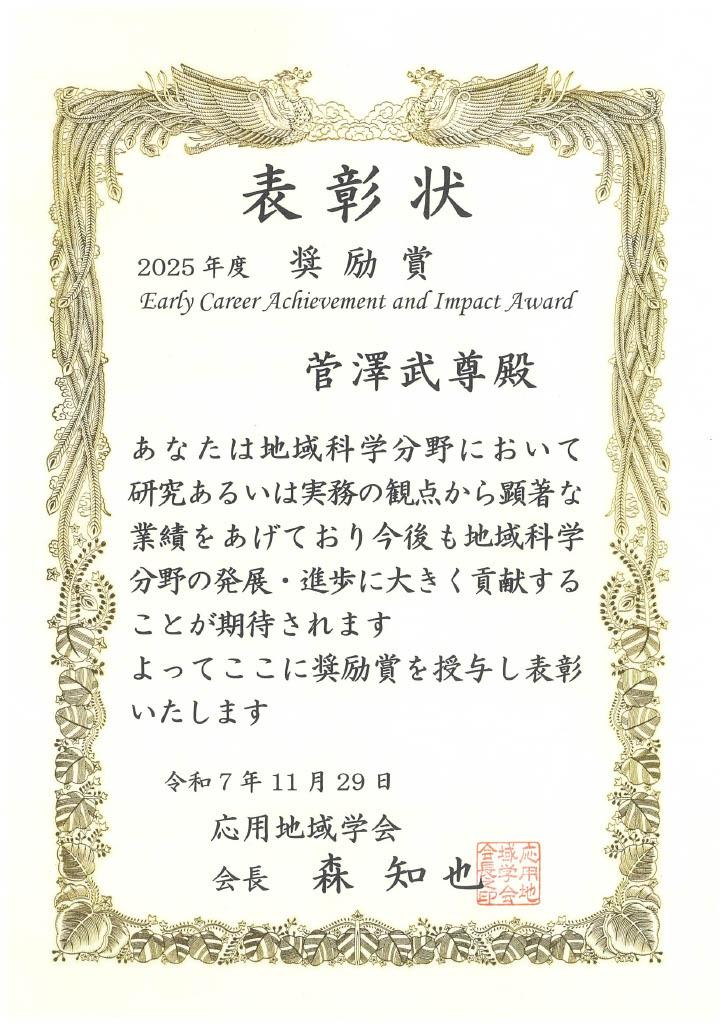 この受賞は、地域科学分野の研究、あるいは実務の観点から顕著な業績をあげており、日本における地域科学分野の発展・進歩に大きく寄与することが期待される若手研究者に対して、その研究成果を讃え、贈呈されたものです。